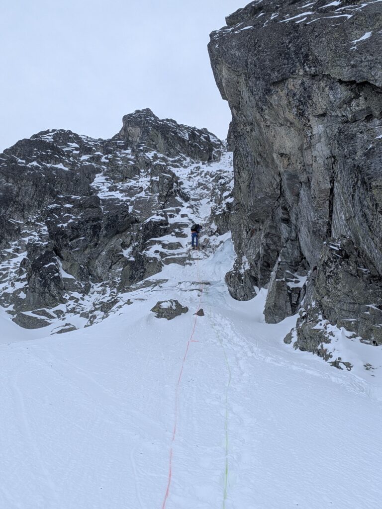 Náš lezecký výstup by sa dal opísať nasledovnou zápisnicou: Ja ako nadšenec psychológie som si zavolal Jakuba (ďalej už pacient) na sedenie, teda lezenie. Od samého začiatku to bol úspech za úspechom. Pacient si zopakoval v prvej dĺžke mená všetkých svätých a za použitia Sokratovskej metódy (pýtaj sa ako, prečo, začo, na čo, ako malé dieťa) pochopil že prečo lezenie v zime, najmä v mixoch nerobí. S mojím pacientom sme si prehĺbili dôveru, po tom ako sme bez slov, so šesťdesiatmetrovým rozdielom vo vzájomnej nadmorskej výške dokázali zrušiť a začať liezť bezpečne a plynulo. Nasledovala moja pasáž, prvé nepríjemné miesto v ktorom som pacienta videl trápiť sa bolo pre mňa nočnou morou. Používajúc lakte, kolená, dlane a ďalšie ľudské údy sa mi podarilo vyštverať na ako tak schodnú plošinku, ktorá však skrývala jedno prekvapko. Cepíny som síce držal ale uvedomil som si že mám zmrznuté ruky, teda, už neboli zmrznuté ale začala sa do nich tlačiť krv. Snažiac sa potlačiť slzy od bolesti, som sa snažil získať čas pri vyťahovaní friendov a vklínencov. Dokým som doliezol na štand začala sa mi krv tlačiť aj do palcov na nohách, ale to už bol problém ktorý sa vyrieši popri tom ako budem stáť na štande a predstavovať si teplučkú chatu. Druhá dĺžka, vyzerá to, že pacient si po predošlom výkone začal viacej veriť odpája sa s vidinou toho že touto cestou sa dostane tam kam chce a letí hore ako víchor. Celú druhú dĺžku som ho nevidel a ani nepočul ako v prvej dĺžke jedinou komunikáciou bolo lano, ktoré svojim státím pri 30 metroch neveštilo nič ľahké predo mnou a Tomáš, ktorý sa rozhodol s Michalom po druhej dĺžke zlaniť, dôvodom bolo, v kontraste s mojím pacientom, že ich viera v dostatočné trenie náčinia je celkom ateistická. Doliezam za pacientom a keď vidím čím si v polovici dĺžky prešiel tak rozmýšľam kam sa podel jeho pud sebazáchovy. Našťastie odtiaľto to už išlo ľahko, tretiu dĺžku preťahal ako nič a boli sme v snehu. Tu som sa konečne dostal ja do vedenia. Aby sa nepovedalo spravil som zopár odbočiek ku kameňom aby som cez ne hodil morálovú slučku a takto bezpečne ďalej traverzoval. 100 výškových metrov, 13 myšlienok na teplú večeru na chate a už sme schádzali. Pacient prešlapal cestu dole, kúsok sme sa spustili na sánko-batohoch, zavolali rodine, že žijeme lebo offline lifestyle sme žili už od včera a poďme späť na chatu.