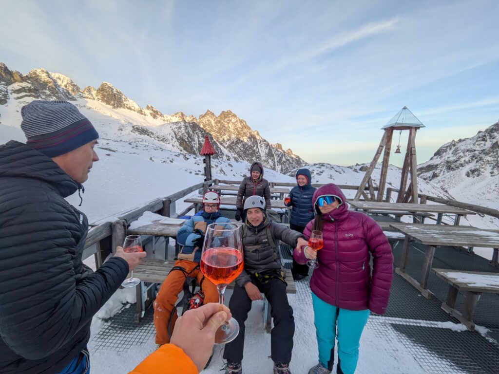Ráno nás v našom prevaľovaní z boka na bok vyruší chatár, ktorý nás volá na raňajky. Vyskočím z postele a po polo-prebdenej noci si letím dať TRI párky. Raňajky vošli do mňa ako do miešačky, zalejem čajík do termosky, vymením hroty na mačkách a cepínoch a dokým s Kubom nachystám vybavenie na naše potulné divadlo, Tomáš a Mišo nám už prekopávajú cestu na slavkovskú kopu. Pod nástupom sa ešte raz stretneme, poprajeme si veľa šťastia a hor sa trpieť. Ako každý vie Jakub je veľký vtipkár a pýta sa ma či chcem ísť ťahať prvú dĺžku. Ja sa naňho zamračím či mi toľko verí alebo ho už omrzel život a s pokojom Angličana mu veľmi jemne naznačím, že kým sa dnes nedostaneme niekam kde to drží čakany a tomu na čom stojím budem môcť aj veriť, tak ma na prvom konci neuvidí.